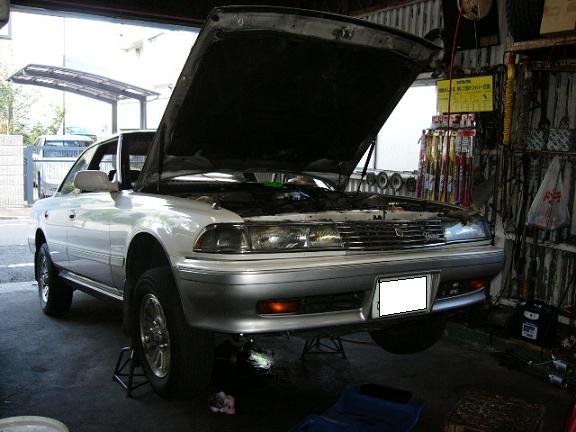 ラジエター液漏れでお預かりしていますマークU君の作業に取り掛かります。
